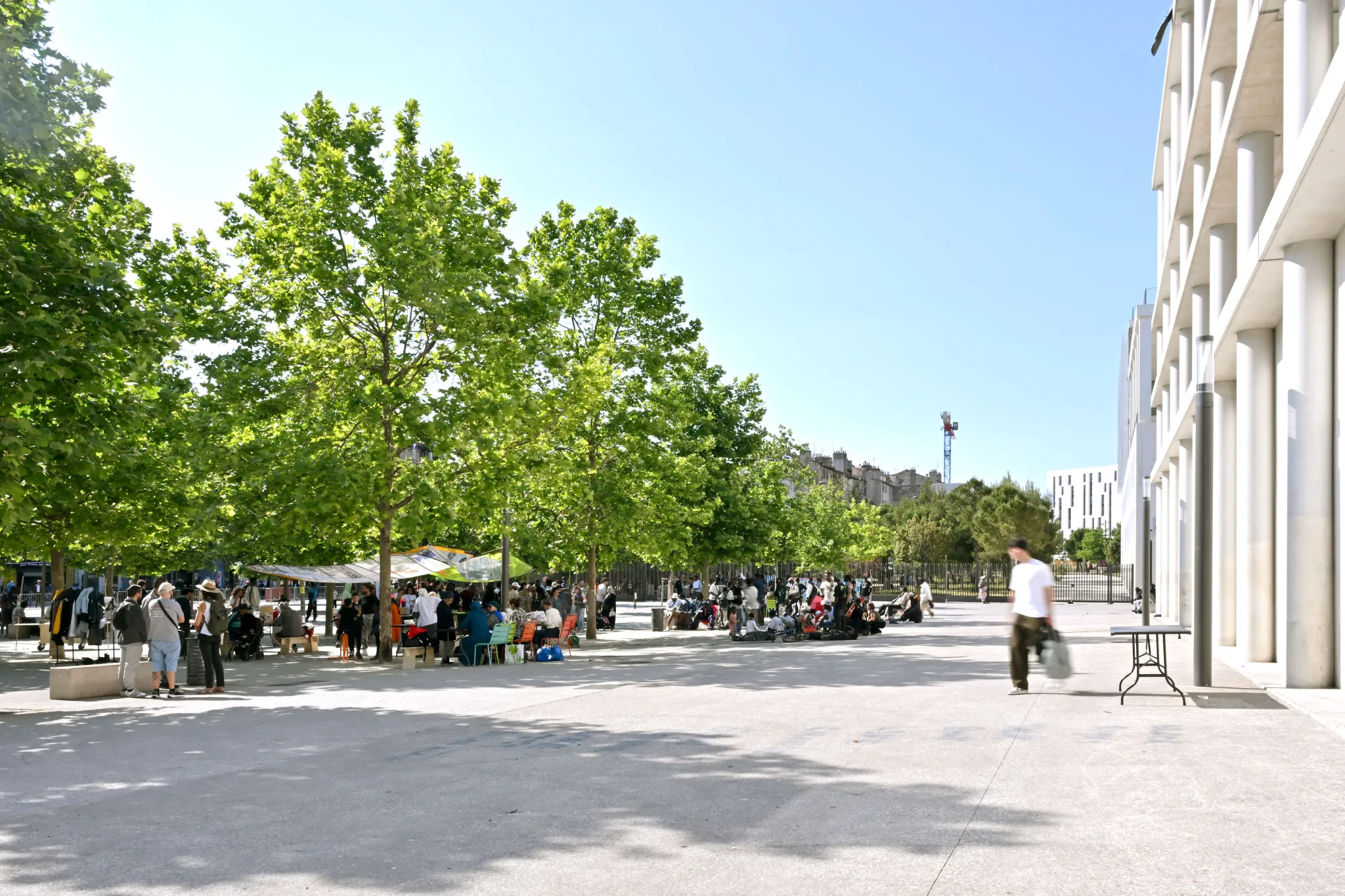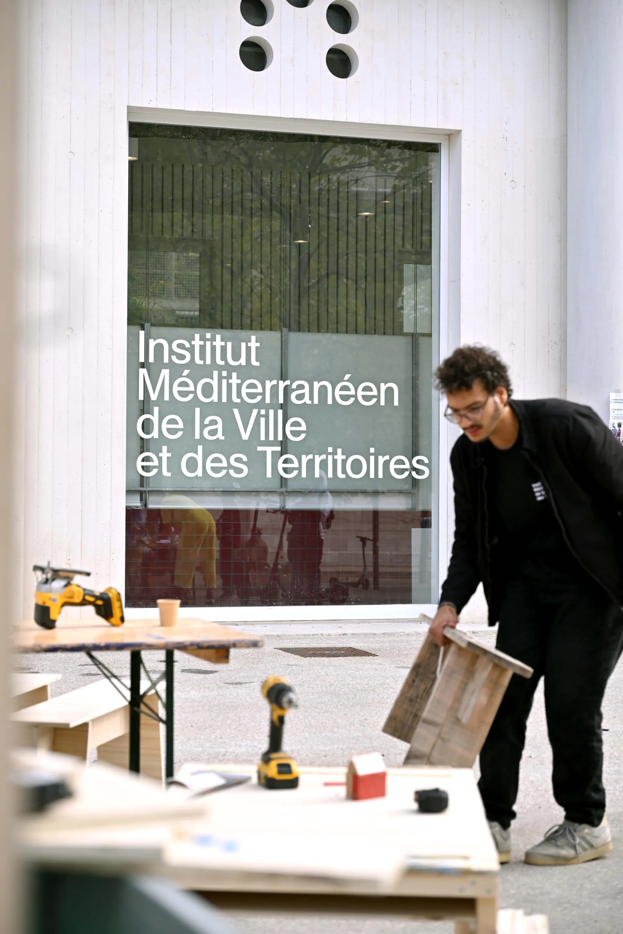 L’association Yes We Camp a mené un projet collaboratif visant à dynamiser l’espace public autour de l’IMVT, sur la place de la Porte d’Aix. L’objectif principal était de favoriser l’ouverture de l’école sur son environnement, en incitant à des interactions participatives entre étudiants, enseignants et habitants. Cette initiative a été pilotée par le groupe « École en Ville », composé d’enseignants et d’étudiants de l’IMVT, avec le soutien d’Euroméditerranée et s’est traduit par la mise en d’ateliers ouverts, la co-conception de mobiliers modulaires et l’instauration de dispositifs propices aux échanges, comme un café mobile. Une fête de quartier annuelle au mois de mai fait maintenant partie de la programmation commune afin de rencontrer les voisins, les acteurs du quartier, les habitants et usagers réguliers de la place.