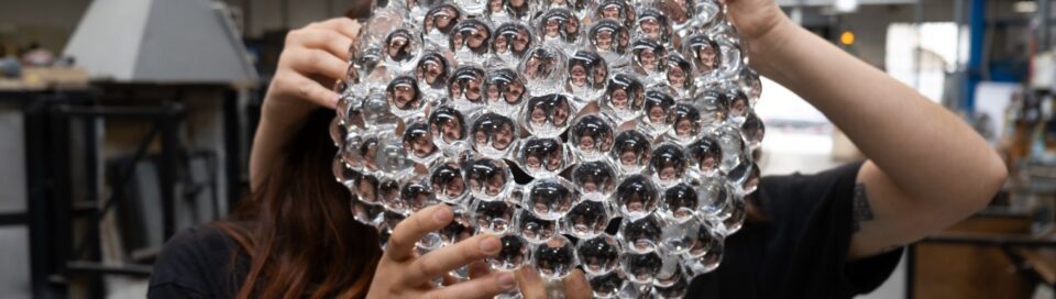 Ainsi débute en 2025, l’année de résidence de création de Sacha Parent et Valentine Tiraboschi au Cirva. Dans l’atelier, elles souhaitent « poursuivre leurs recherches autour du sable, afin de faire émerger du décor ou des volumes. L’idée n’est pas d’effectuer des transpositions de notre répertoire formel dans une matérialité verre, mais plutôt d’interroger les techniques de mise en forme du verre à travers le prisme du grain. Dans notre travail, technique et vocabulaire sont intrinsèquement liés. Cette recherche s’appuie sur celles de nos prédécesseurs. Gaetano Pesce et son séjour à Marseille sont une grande source d’inspiration pour nous ; plus particulièrement certaines techniques qu’il a mis au point comme « Joliette », « Sable », ou « Mistral ». ».