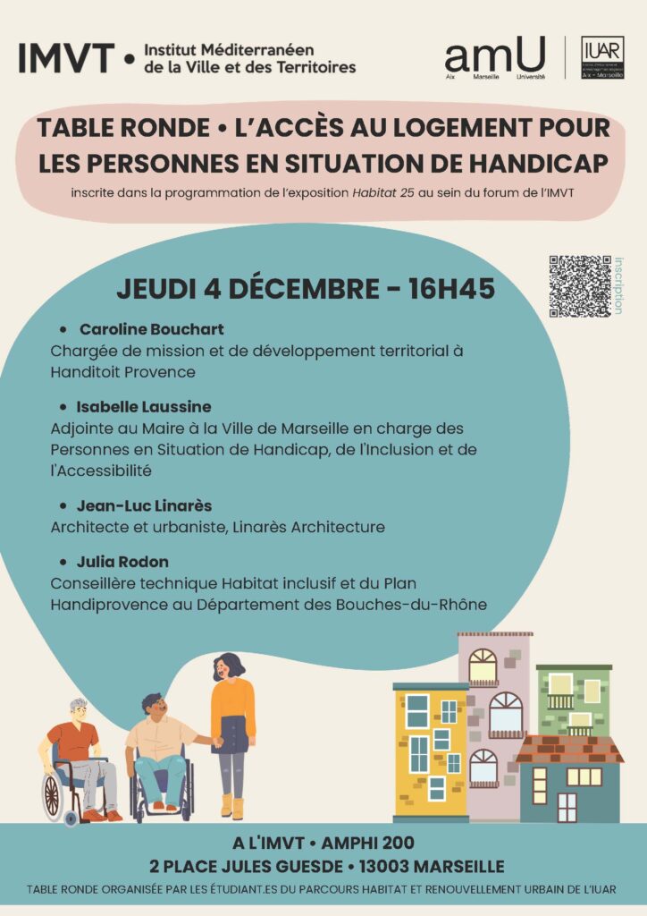 Dans le cadre de l’enseignement « Planification et politiques publiques de l’habitat » porté par Lina Raad, les étudiants du Master 2 Urbanisme et Aménagement, parcours Habitat et projets de renouvellement urbain, de l’IUAR Aix-Marseille Université, organisent et animent une table ronde sur l’accès au logement pour les personnes en situation de handicap.