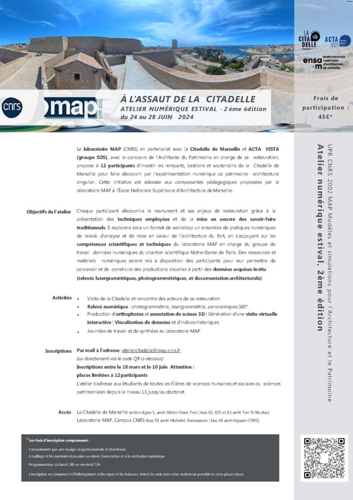 Inscriptions entre le 18 mars et le 10 juin 2024 à cette adresse : ateliercitadelle@map.cnrs.fr
