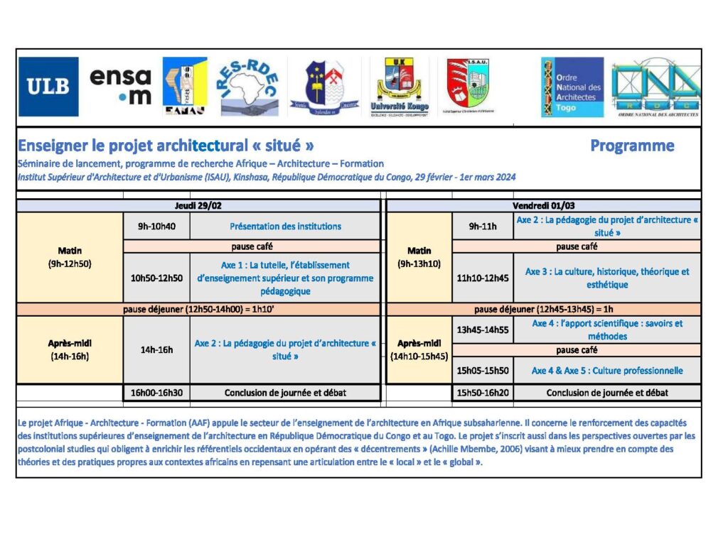 « Le projet Afrique – Architecture – Formation (AAF) appuie le secteur de l’enseignement de l’architecture en Afrique subsaharienne. Il concerne le renforcement des capacités des institutions supérieures d’enseignement de l’architecture en République Démocratique du Congo et au Togo. Le projet s’inscrit aussi dans les perspectives ouvertes par les postcolonial studies qui obligent à enrichir les référentiels occidentaux en opérant des « décentrements » (Achille Mbembe, 2006) visant à mieux prendre en compte des théories et des pratiques propres aux contextes africains en repensant une articulation entre le « local » et le « global ».