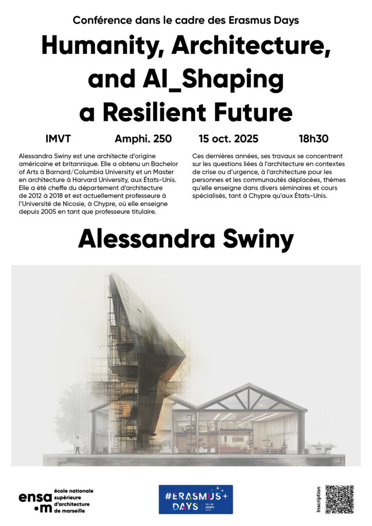 Mercredi 15 octobre 2025 • Conférence d’Alexandra Swiny : « Humanity, Architecture, and AI_Shaping a Resilient Future » • 18h30 • Amphi 250