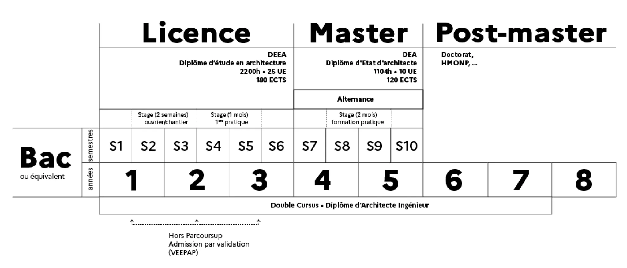 Selon les parcours personnels et suite à la valorisation des acquis et expériences, il est possible d’intégrer la 2ème année du 1er cycle conduisant au Diplôme d’Etudes en Architecture, conférant grade de licence ou la 1 ère année du 2ème cycle conduisant au Diplôme d’Etat en Architecture, conférant grade de master.