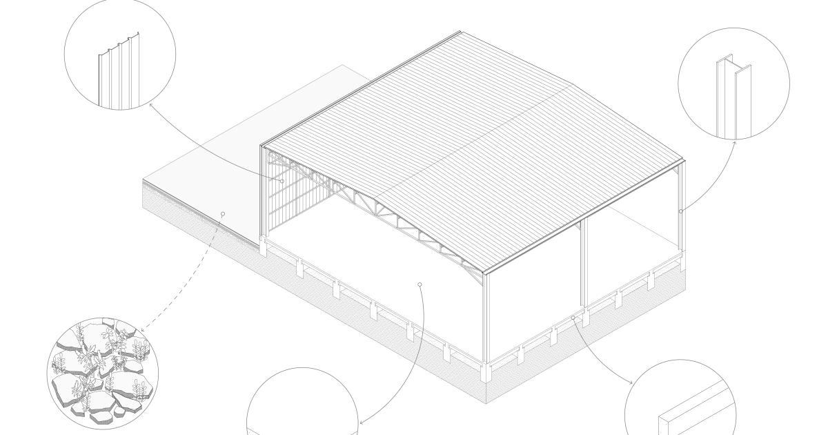 La zone d'activité de l'Anjoly à Vitrolles est conçue dans les années 1980 pour la logistique. Elle est aujourd'hui vieillissante, en grande partie obsolète et fortement imperméabilisée. Le projet amorce une transformation profonde de cette zone par la création d'un parc séquencé autour de la Cadière pensé comme un itinéraire bis du GR2013, un sentier de randonnée métropolitain. L'objectif consiste à redonner de l'espace à cette rivière, limiter les inondations et reconnecter la zone d'activité aux quartiers voisins. La séquence principale du projet prévoit la déconstruction partielle d'un hangar logistique en zone inondable. Deux travées sont conservées pour accueillir un équipement mixte : complexe sportif, restauration, auberge de jeunesse et atelier vélo. La dalle portée du hangar est découpée pour favoriser l'infiltration des eaux. Ce projet place la ripisylve de la Cadière au cœur de la réflexion. Il accompagne la transition tant sociale qu'écologique de cette zone pour les travailleurs, les habitants et les randonneurs dans un contexte de réchauffement climatique.