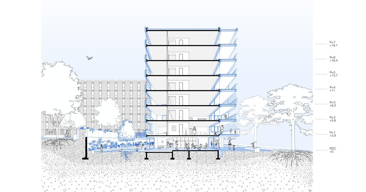 Le projet repense la partie haute de la Castellane en plaçant l’enfant au cœur de la réflexion, en s’appuyant sur les usages existants et les échanges menés avec les habitant·es. Il s’inscrit dans le cheminement nord-sud des enfants, entre l’école du haut et l’école du bas. Le bâtiment E, aujourd’hui menacé de démolition, devient support de projet : il abrite déjà une garderie et un centre aéré, discrets mais essentiels. Le rez-de-chaussée, réparti sur deux niveaux, est restructuré : une PMI est recréée dans les anciens locaux de la garderie, avec accueil, salles de consultation, salle de repos et bureau de direction. À côté, le centre aéré est repensé avec une nouvelle cuisine et une entrée extérieure conservant son intimité. Côté est, les halls sont prolongés par des locaux vélos, jardins et poubelles. Une passerelle en bois sur socle de pierre relie les halls et dessert un escalier vers le second niveau, où une crèche est installée. Accessible depuis l’allée principale, elle propose trois sections identiques avec dortoirs, salles d’éveil traversantes, terrasses et salle de jeux d’eau. Les espaces sont conçus pour encourager l’autonomie : sas d’entrée, vestiaires adaptés, espaces modulables et fenêtres à hauteur d’enfant permettent une appropriation progressive. Au deuxième étage, des logements adaptés aux familles nombreuses ou intergénérationnelles sont testés. Aux étages supérieurs, les appartements existants sont améliorés par des extensions en balcon, jardin d’hiver, et une isolation extérieure en bardage bois.