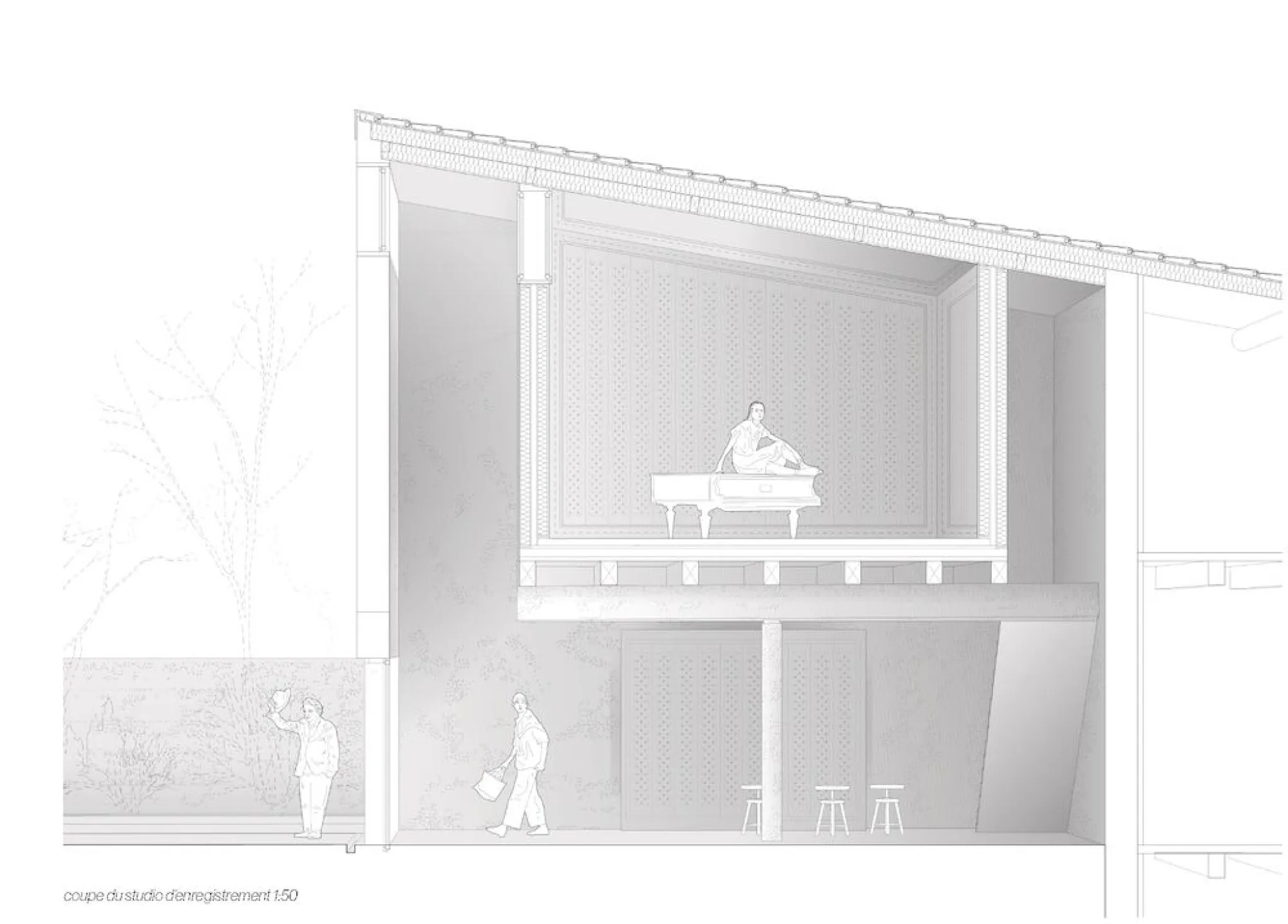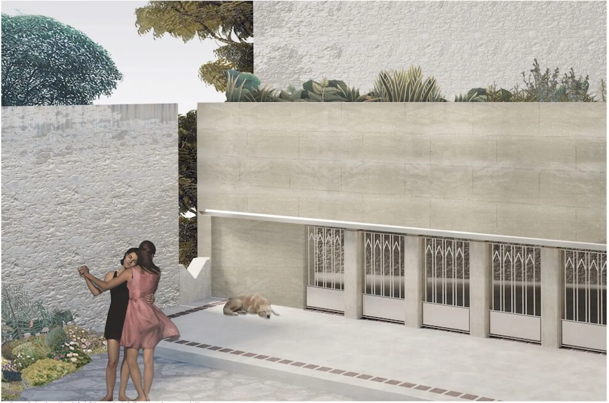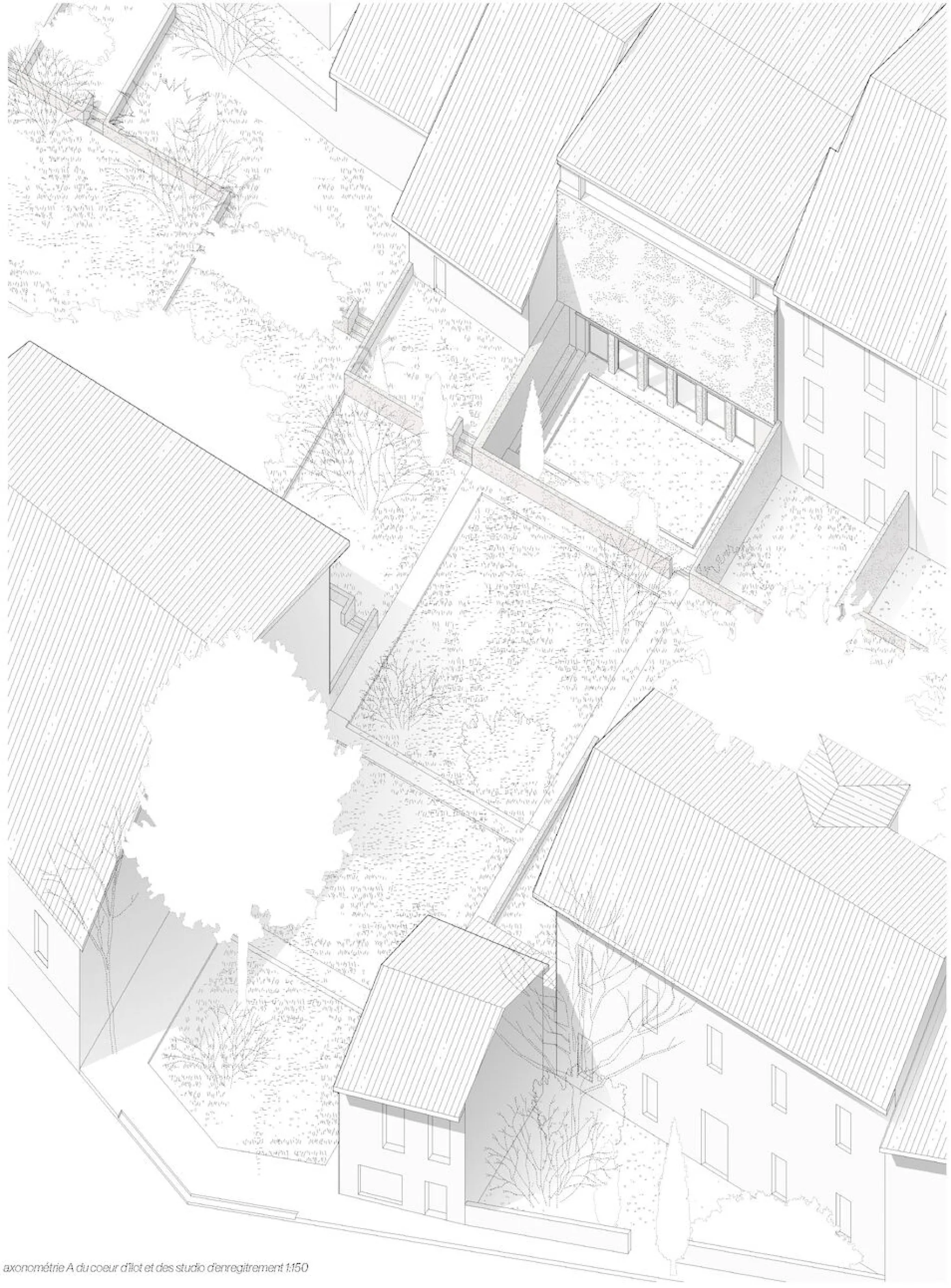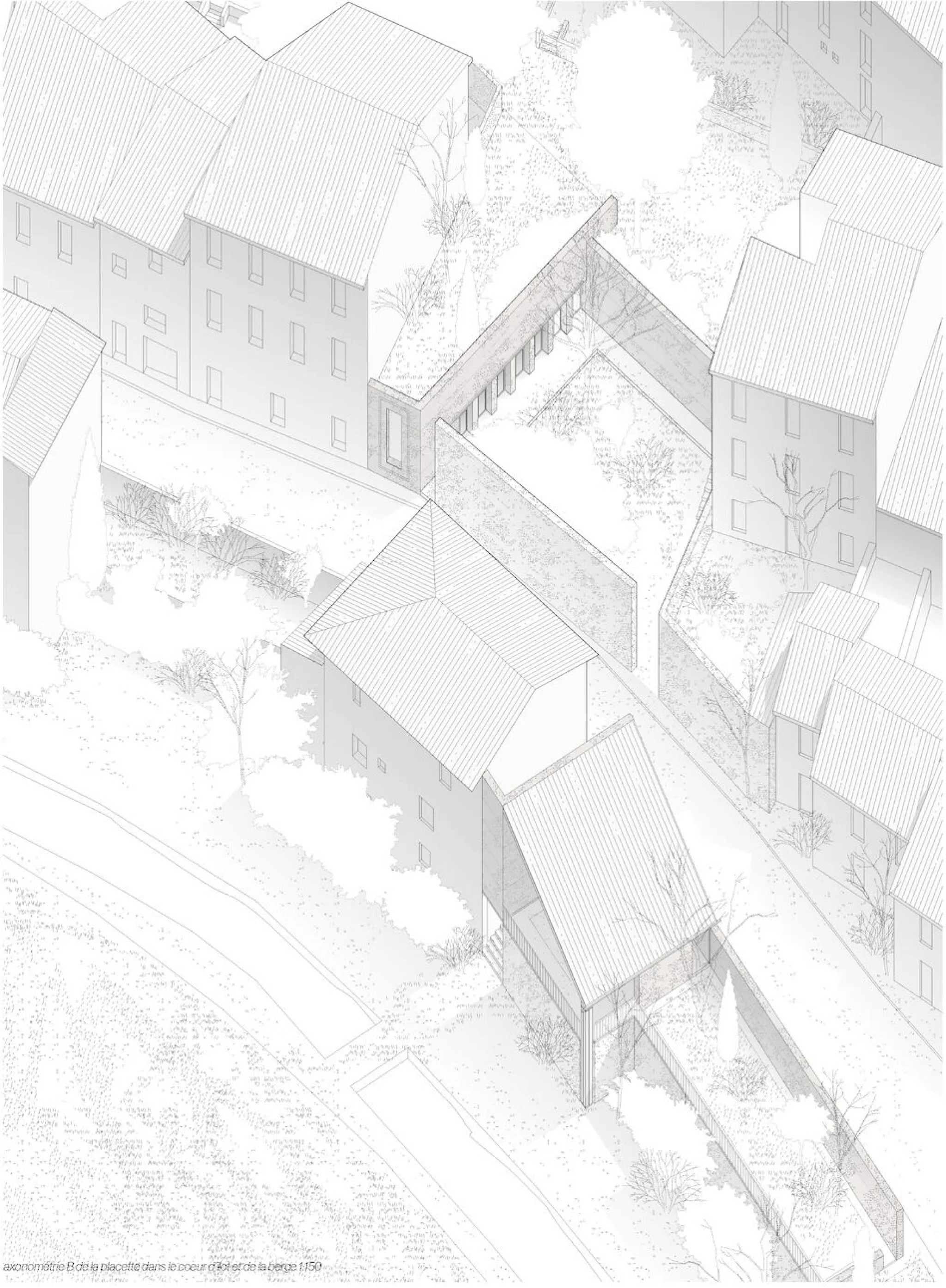 Le projet se situe à Marseille, dans le quartier du Cabot, où l’extension du boulevard Urbain Sud menace de découper les derniers espaces communs. Parmi eux, le site des Charmettes, ancienne maison de retraite fermée depuis 2012, forme une clairière cachée au cœur du quartier : un vaste terrain de 4 ha blotti derrière ses murs, avec des pins qui émergent et délimitent le site, des massifs environnants qui le blottissent en leur sein, ponctué de jardins en friche, en attente d’un nouvel usage. Face à ce risque, le projet propose d’anticiper et de préserver cette clairière comme un lieu fédérateur, capable de renouer avec l’esprit d’accueil originel du Cabot. Il s’appuie sur des gestes simples liés aux besoins quotidiens : se restaurer avec une cantine de quartier, se vêtir grâce à une ressourcerie, s’abriter avec des logements. Ces usages se tissent autour d’un théâtre ouvert qui deviendrait le cœur vivant de la clairière : le mur d’enceinte se transforme en fond de scène, le sol agricole est réactivé par un jardin et une bergerie, la bastide devient un foyer qui distribue les rôles et les parcours. Souligner les limites de cette clairière permet une mise à distance, tout en révélant l’ordinaire comme une scène commune. Par des percées, des rythmes et des espaces partagés, le site se rouvre au quartier, recompose un lieu de rencontre, préservant ainsi un espace de respiration et de lien social au sein du tissu urbain.