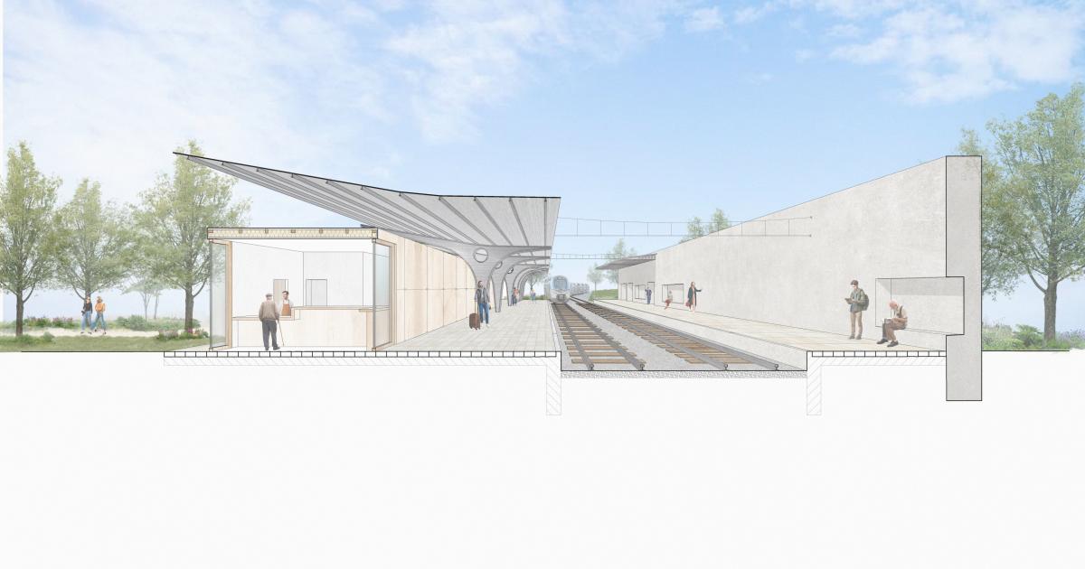 Marignane possède une gare, liée à celle-ci par une avenue historique de la ville : l’avenue de la Gare. La ligne de chemin de fer n’est actuellement exploitée que pour le fret entre les raffineries de la Mède et la gare du Pas-des-Lanciers. Le projet a pour ambition d'étendre cette ligne jusqu’à Martigues, d’ouvrir cette gare aux voyageurs, en déplaçant l'activité déjà présente dans la zone industrielle au sud du Rove. Cette nouvelle gare de voyageurs permet aux 9.000 actifs marignanais travaillant en dehors de la commune, de rejoindre les grands bassins d’emplois de la métropole. La gare permet aussi aux habitants de la métropole de rejoindre et visiter Marignane et son littoral balnéaire, le Jaï, sans voiture. Le site se constitue d’un parvis, d’un hall autour d’un pavillon et d’un hangar déjà existant. Tous sont réhabilités pour les besoins de la gare et du quartier. Le parvis permet de composer un nouveau carrefour plus apaisé, laissant plus de place aux piétons et aux usagers de l’espace public. Le nouveau hall de gare est constitué de dix portiques métalliques portant une toiture ombragée, un espace libre en proximité directe avec le cours d’eau du Raumartin. De l’autre côté des rails, on retrouve un mur en béton qui joue le rôle de tampon avec le tissu pavillonnaire, ce qui permet d’abriter du soleil les usagers de la gare. Le tout, forme un ensemble qui s’articule autour du rail, des bâtiments existants et du Raumartin.