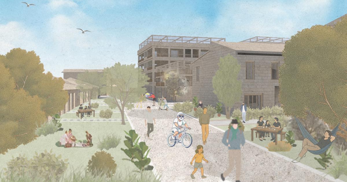 Port-Saint-Louis-du-Rhône, entre mer, Rhône et zones humides, fait face à des enjeux économiques, sociaux et environnementaux. Le site du projet, situé sur l’ancien camping des Lauriers Roses, constitue un point stratégique entre deux quartiers et permet de retisser des liens urbains. Ce territoire fragmenté souffre de friches industrielles, d’un front de mer inaccessible et d’un manque d’équipements. Le projet répond à ces défis en valorisant les berges, en densifiant intelligemment le tissu urbain et en favorisant les mobilités douces. Il développe un Campus Agricole et des Métiers de la Mer avec des logements pour étudiants de septembre à juin et des habitats saisonniers l’été. Les activités proposées (agroforesterie, algoculture, halle gourmande, forêt comestible) visent une autonomie locale et une économie circulaire. L’architecture se veut locale en reprenant l’identité camarguaise du site, avec l’usage du béton d’huître et de la pierre. Des toitures-terrasses, des duplex traversants et des loggias aux angles dynamisent les édifices.